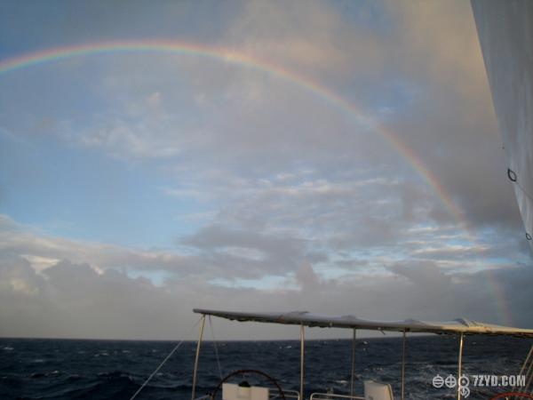 感谢上帝,一夜的暴风骤雨,浪最高的时候达到了7米,我与汤姆有惊无险的行驶出了风暴中心,早上突然看到了船后出现一道彩虹