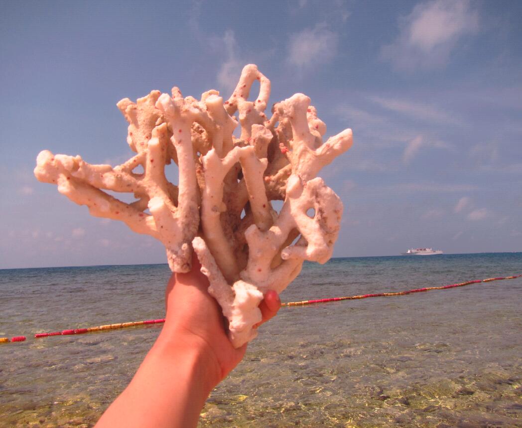 西沙水很清,可以看到很远,水下珊瑚一大片一大片的,珊瑚种类很多,有的珊瑚可以长成心形,很奇特。各种鱼在珊瑚间游来游去,也能够看到一尺长的大鱼,不过水下看东西都显得大些。水下有蓝色的海星和黑黑的海参状的生物,鱼的种类也挺多,浮潜的过程中总能看到奇怪的生物,有一些惊喜。我带了水下相机,教练会帮忙拍照。教练穿了脚蹼,可以游到水下较深的地方,但是全程水都不深,估计平均水深不到8米吧。