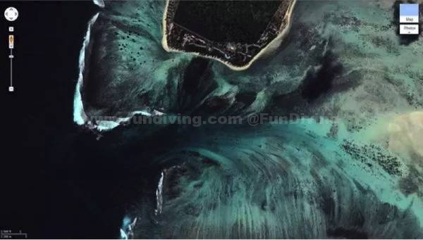 "水下瀑布奇观"位于毛里求斯西南端的岛屿,从高空中看去,湛蓝透明的海水之下竟然有一个银白色的"瀑布"!这个"瀑布"似乎就"沉浸"在海岛的悬崖边上。大量银白色的"水"顺着悬崖边直冲而下,很快就没入黑漆漆的海地深渊……