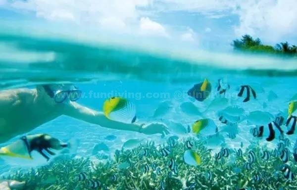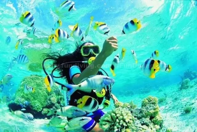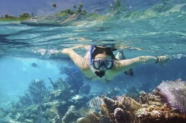 浮潜装备一般都是免费租借的。柔美的蓝天,五彩斑斓的沙子、礁石、珊瑚,在阳光的折射下,海水变得五颜六色。在海里,和你一起游的除了鱼还有只在电视上才看到过的十字海星、小海马、虎皮斑纹贝。也许你会以为是掉进了水族馆里,但这些都真实地呈现在眼前。