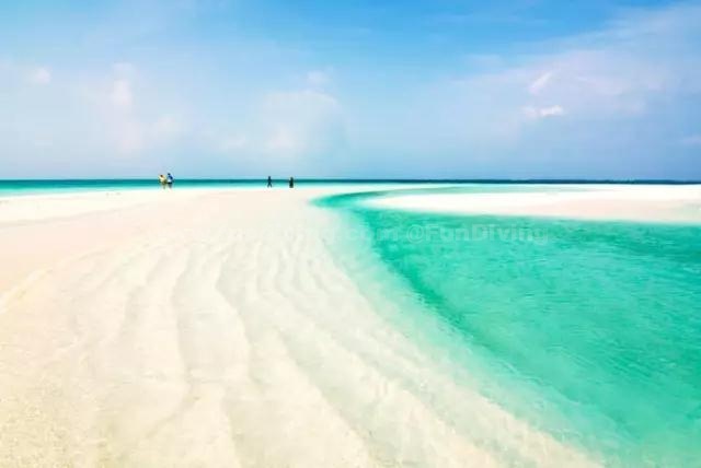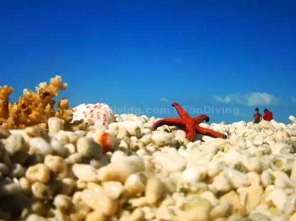 岛上全是细软的白色海沙,混着被吹打碎的红珊瑚粉末,水清沙幼。而这里的海水像钻石一样晶莹透亮,仅凭肉眼便能看到海底的景象。