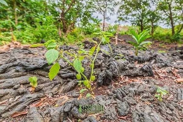 时间匆匆走过,如今在黑色熔岩的缝隙中已经长出了一株株绿色的生命,它们在这片贫瘠的土壤上冲破自然的桎梏奋力地生长着。
