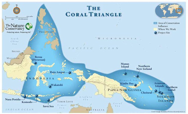 当地语言,Raja(王)Ampat(四)的意思,国内潜水员就喜欢合称为四王群岛。四王群岛位置偏远,远离人类活动干扰,紧邻赤道,是几个大洋的交汇处,使得这里成为“物种工厂”。这里已知的鱼类有2650种,珊瑚约300种,占全球珊瑚品种的75%,说四王群岛是“珊瑚金三角”的核心一点都不错。